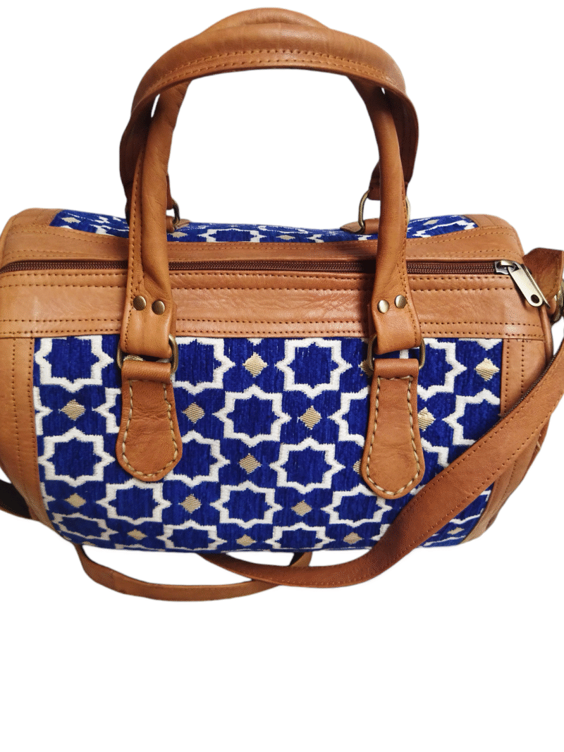 € 92,00Original price was: € 92,00.€ 74,00Current price is: € 74,00.تصميم فريد: تتميز الحقيبة بتصميم أنيق وعصري، يجمع بين الجلد الطبيعي عالي الجودة والقماش المزين بنقوش هندسية زرقاء وبيضاء على خلفية بيضاء. هذا المزيج من… -