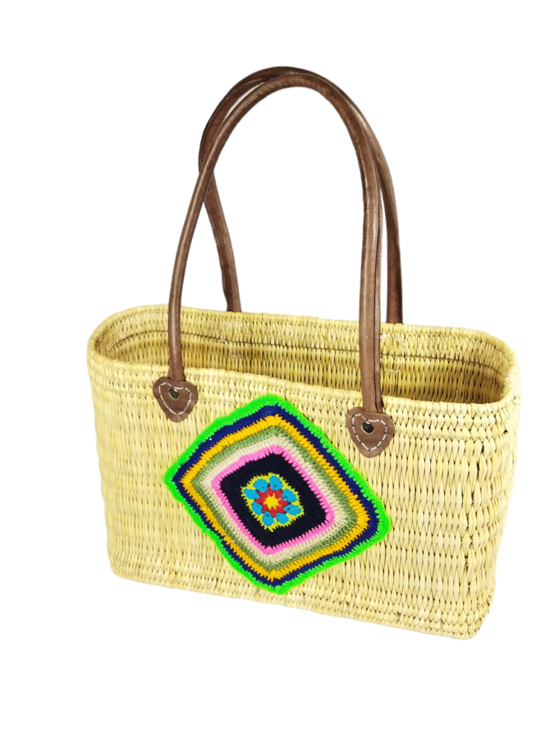 Straw basket decorated with a piece of colorful cotton